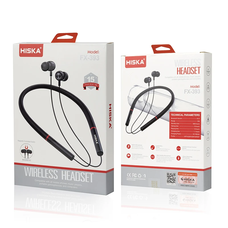 هندزفری بلوتوثی مدل FX-393 محصولی با کیفیت که توسط برند هیسکا طراحی و روانه بازار شده است. این هدفون دورگردنی امکان گوش دادن به موسیقی را هنگام ورزش کردن و فعالیت های روزمره برای شما به ارمغان میآورد. طراحی این هندزفری بلوتوثی به خوبی انجام شده تا شما به راحتی امکان استفاده از آن را داشته باشید. گوشی های سیلیکونی FX-393 نیز از خاصیت آهنربایی بهره میبرند و با اتصال دو گوشی به صورت مگنتی به یکدیگر در زمانهای عدم استفاده از هندزفری، از گره خوردن آن جلوگیری کنید.پورت شارژ هدفون بلوتوثی مدل FX-393 روی بدنه گردنی قرار گرفته و شما قادرید به راحتی توسط کابل MICRO USB باتری داخلی هندزفری را شارژ کنید.