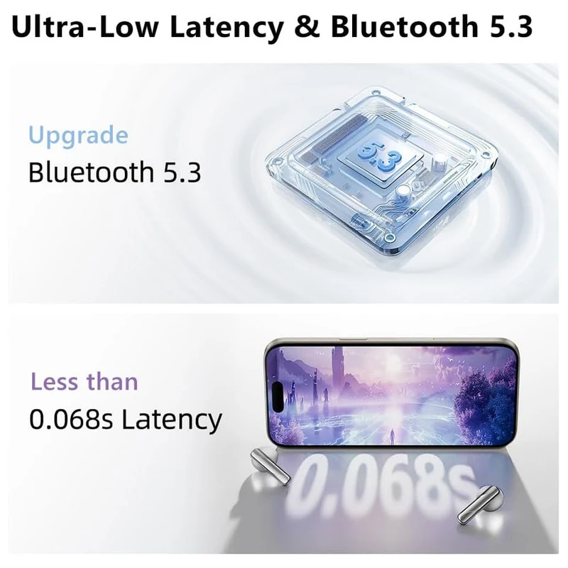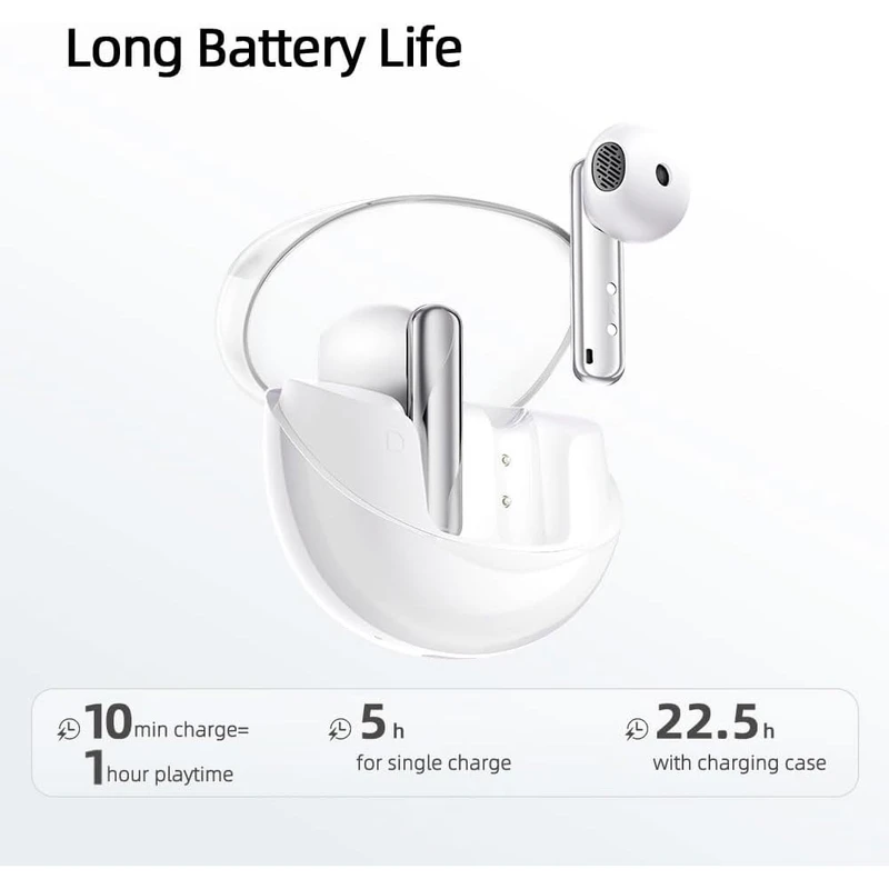 مجهز به ۴ میکروفون برای برقراری تماس شفاف / تاخیر ۶۸ میلی‌ثانیه‌ای / ۱۰ دقیقه شارژ برای ۶۰ دقیقه پخش / هدفون‌ها با وزن ۳.۸ گرم