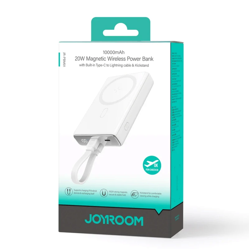 شارژر همراه بی سیم 10000 میلی آمپر جویروم مدل JR-PBM01 پاوربانک جویروم طراحی بسیار مینیمالی دارد و بلافاصله بعد از قرار گرفتن در پشت گوشی‌همراه فرایند شارژ را آغاز می‌کند. اندازه این محصول به قدری کوچک است که به راحتی درون جیب جا می‌گیرد و حمل راحتی دارد؛ همچنین بعد از اتصال به گوشی مانع کار کردن با دوربین آن نمی‌شود. سیم پیچ مغناطیسی آن به صورت دوگانه طراحی شده تا جذب مغناطیسی قابل اعتمادتری را به همراه داشته باشد.